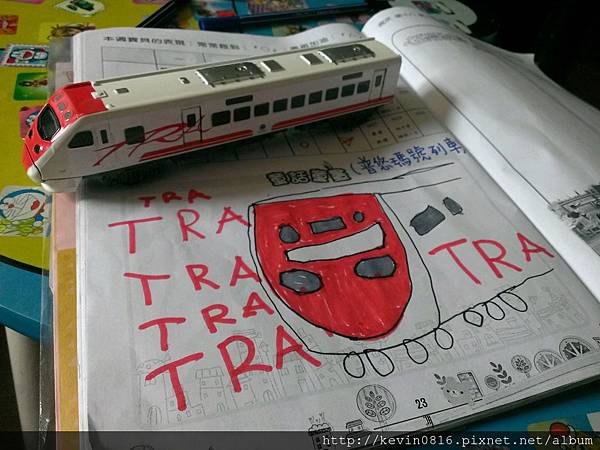 阿公帶小比去夜市買了一台會說話的普悠瑪號 ~~今天陪小比把它畫在親師橋上