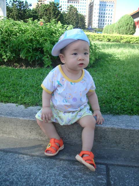 馬麻給他穿上鞋鞋 再試著讓他自己坐著拍照 他也沒有亂動 因為他還很好奇這是什麼地方咧....